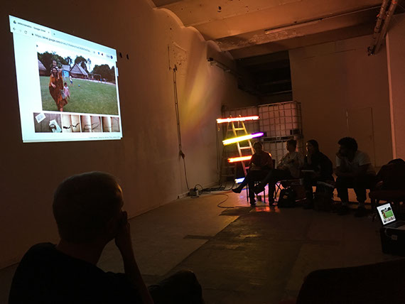 The selection and participation in ¡n[s]urgênç!as 2018 supposes a recognition to 12 politically committed artistic trajectories. The selected artists were: Jeferson Andrade (BR), Alexandra Bisbicus (CO), Andressa Cantergiani (BR), Pêdra Costa (BR), Manuela Eichner (BR), Manuela García Aldana (CO), Lia Kruchen (BR), Moana Mayall (BR), Julia Mensch (AR), Alberto Morreo (BO), Rafael Puetter (BR), Melanie Rivera Flores (PR / USA); In conversation with cultural agents of the Berlin scene: Elena Agudio (IT), Valeria Fahrenkrog (CH), Júlia Frate (BR), Paz Guevara (CH), Júlia Gutiérrez Peris (ES), Teobaldo Lagos Preller (CH), María Linares (CO), Wilma Lukatsch (DE), Ana Maria Millán (CO), Cristina Moreno Garcia (ES), Vanina Saracino (IT), Caique Tizzi (BR / IT). The professional dinner was facilitated by the artists of the Sari-Sari project in Berlin (Joseph Patricio & Danilo).